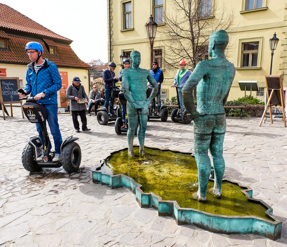 - Piss: Two bronze men peeing into a fountain shaped like the Czech Republic. It is outside the Kafka Museum.